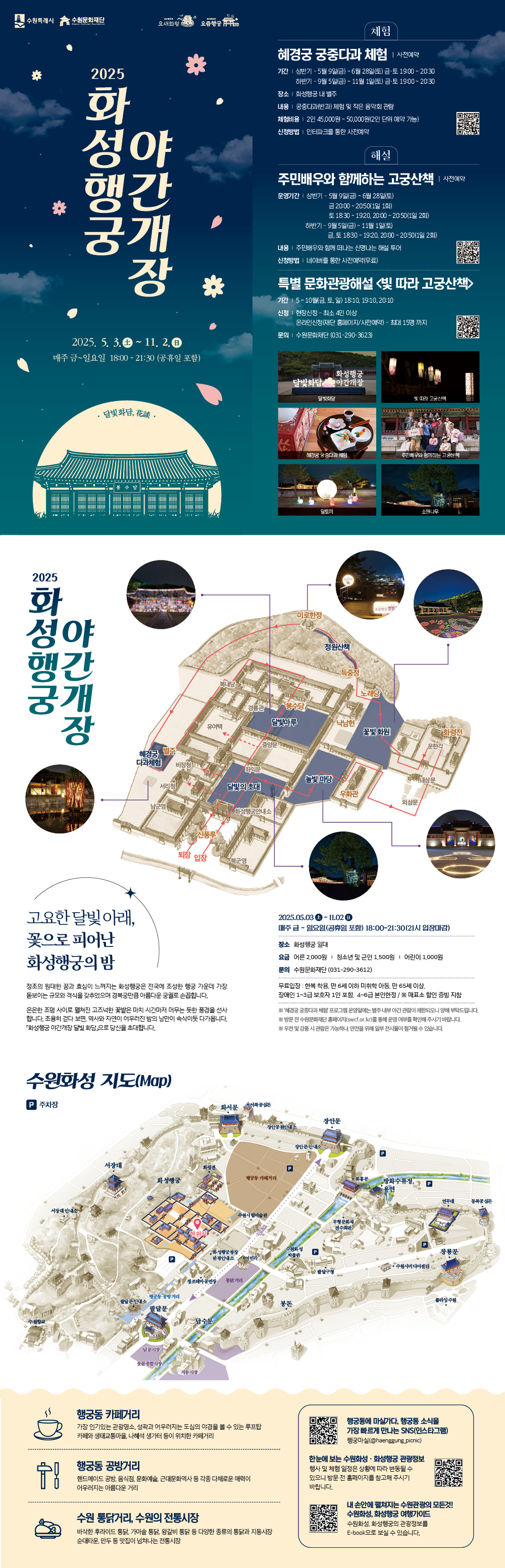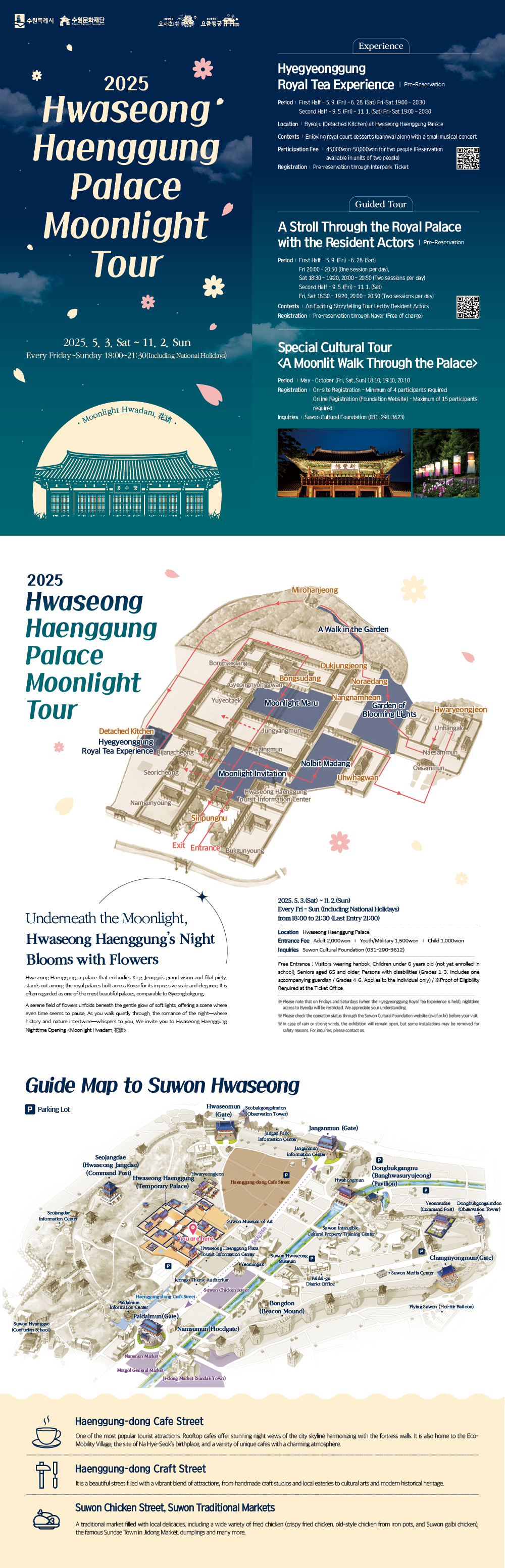 도심 속 아름다운 궁궐의 야경과 고즈넉한 분위기, 달빛과 초롱빛을 따라 거닐다보면 행궁 곳곳의 이야기를 만날 수 있습니다.